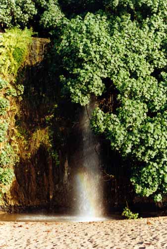 スルの滝はすばらしい所として知られている。その海岸で滝の水が砂に落ちて海辺に夕日を見える。